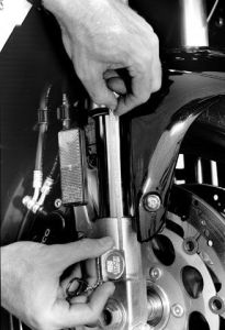 The first step to setting up any bike is to set the spring sag and determine if you have the correct-rate springs. Spring sag is the amount the springs compress between fully topped out and fully loaded with the rider on board in riding position. It is also referred to as static ride height or static sag.