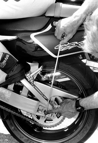 Step 4: The spring sag is in the middle of these two measurements. In fact, if there were no drag in the linkage, L2 and L3 would be the same. To get the actual sag figure you find the midpoint by averaging the two numbers and subtracting them from the fully extended measurement L1: static spring sag = L1 – [(L2 + L3) / 2]. Step 5: Adjust the preload with whatever method applies to your bike. Spring collars are common, and some benefit from the use of special tools. In a pinch you can use a blunt chisel to unlock the collars and turn the main adjusting collar. If you have too much sag you need more preload; if you have too little sag you need less preload. For roadrace bikes, rear sag is typically 25 to 30mm. Street riders usually use 30 to 35mm. Bikes set up for the track are a compromise when ridden on the street. The firmer settings commonly used on the track are generally not recommended (or desirable) for road work.
