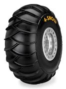 Snow tires for all terrain vehicles are also rather strange in appearance. Instead of vertical treads that run around the perimeter of the tire, they have horizontal treads that look a lot like snow chains. The snow chain like threads allow the tires to grip into the snow rather than spinning in it. The tires also usually very soft and pliable rubber which prevents them from spinning in the snow as well.