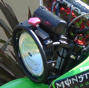 For night riding around camp and trails on the 110 we opted to install a Trailtech 8” Halogen race light that we picked up used. While not as popular and requiring more power than HID lighting, Halogen lights are generally much cheaper to purchase. In addition the Halogen light gives off a more yellow light with very good fill in lighting around the main beam of light. Many people actually prefer Halogen to HID lights for slower/tighter trail riding because more area surrounding the bike is lit up. This allows for better visibility over rocks and roots over HID lighting with fewer shadows. HIDs on the other hand are often preferred because they require less power to run and offer a more intense direct beam which is good for higher speed riding.