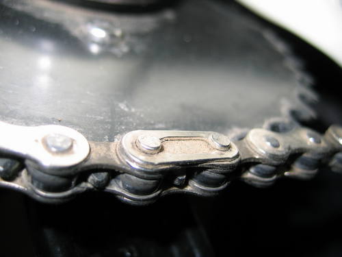 7) Place the new chain on the front sprocket and pull it through to the rear sprocket. Place the master link onto the open ends of chain to join them. If you are installing an O-ring type chain, several O-rings and lubricant will be included with the master link. Slide the O-rings onto the new link, and coat them liberally with lubricant before sliding it onto the rear of the chain. Install the remaining O-rings onto the pins, coating them with lubricant before sliding the link’s side plate into place.