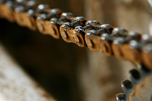 2) Scrape off any caked on mud or debris, using a wire brush. If you have an O-ring chain, simply wipe with a rag, as a wire brush could potentially damage it.