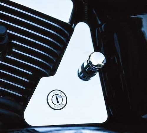 The heart of the kit is a chromed billet plate that nestles in between the rear cylinder and the frame, just in front of the left side cover. Both the choke knob (dressed in a spiffy billet cover) and the ignition switch mount to the plate, which cleverly mounts to the OE choke-cable bracket. (This is why Nomad owners will need to buy a Classic choke bracket.) Installation is straightforward but it takes a few hours—only because of the care and dexterity required when working with the main wiring harness.