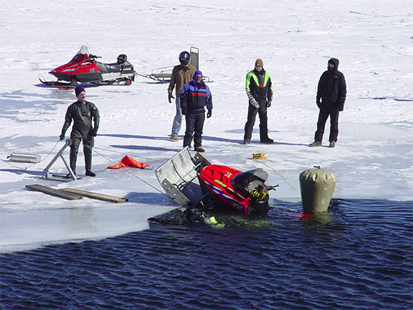 Crossing open water on your snowmobile always looks easy until you get slightly off course and bury it in the lake. Saving yourself from the frigid waters is only part of the problem. You now have to recover the sled from the lake to avoid environmental problems when the oil and fuel drain into the water. Once the snowmobile is out of the water, it is wise to drain it and start the engine as soon as possible, to avoid corrosion of the internal components.