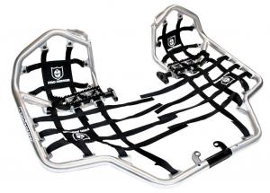 As the name implies, we can think of several things about the Pro Armor Revolution nerf bars that make them revolutionary. First, the nerf bars are large and provide a tremendous amount of protection. This not only keeps obstacles out of your way, but provides a large and forgiving platform. If you do miss the peg once in a while, you’re not going to be pulled underneath the ATV. Secondly, the Revolution nerf bars come with extended footpegs that feature four rows of gnarly teeth that help you grip the ATV. Finally, the Revolution nerf bars come with interchangeable heal guard inserts. You can choose from aluminum heal guards or nets. I prefer the nets if I am racing in any kind of mud. Although the aluminum heal guards do look trick, they can hold a lot of mud during a wet race. Pro Armor tops off its Revolution nerf bars with screen-printed nets that feature the infamous “knight” logo.