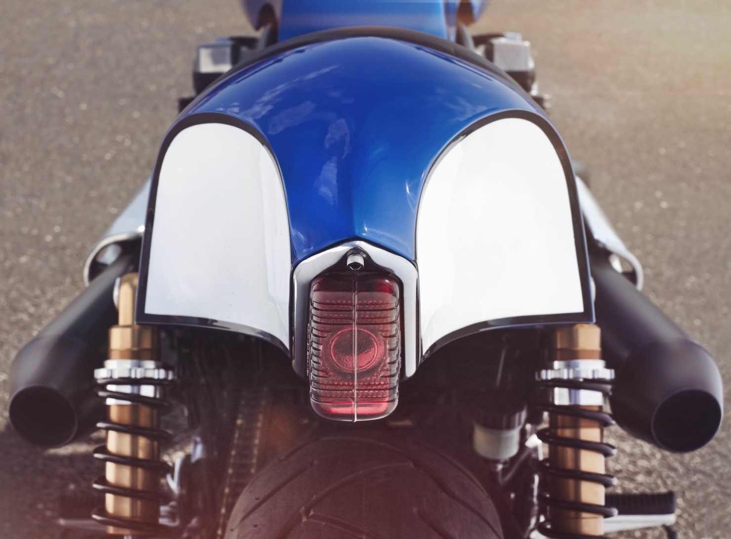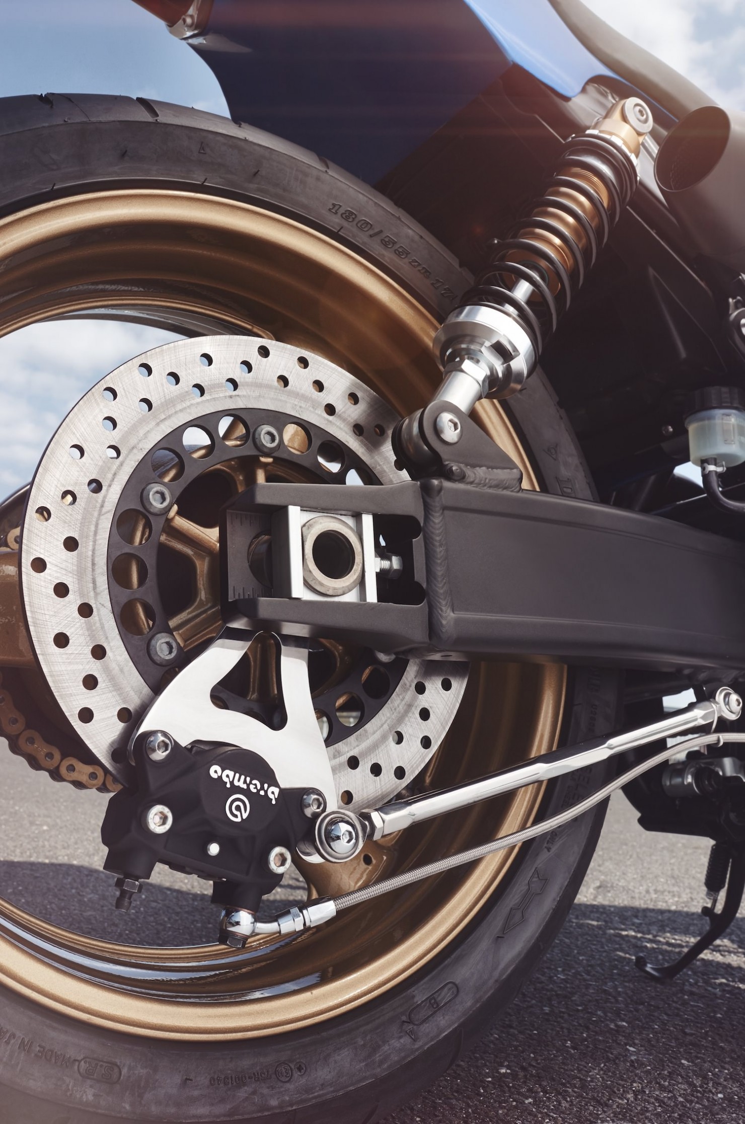 The front and rear brakes were replaced with Brembo units to improve stopping power and the stock fuel tank was removed and replaced with a lower and slimmer version, the rear sub-frame was then removed and replaced with a custom rear cowling and single seat.