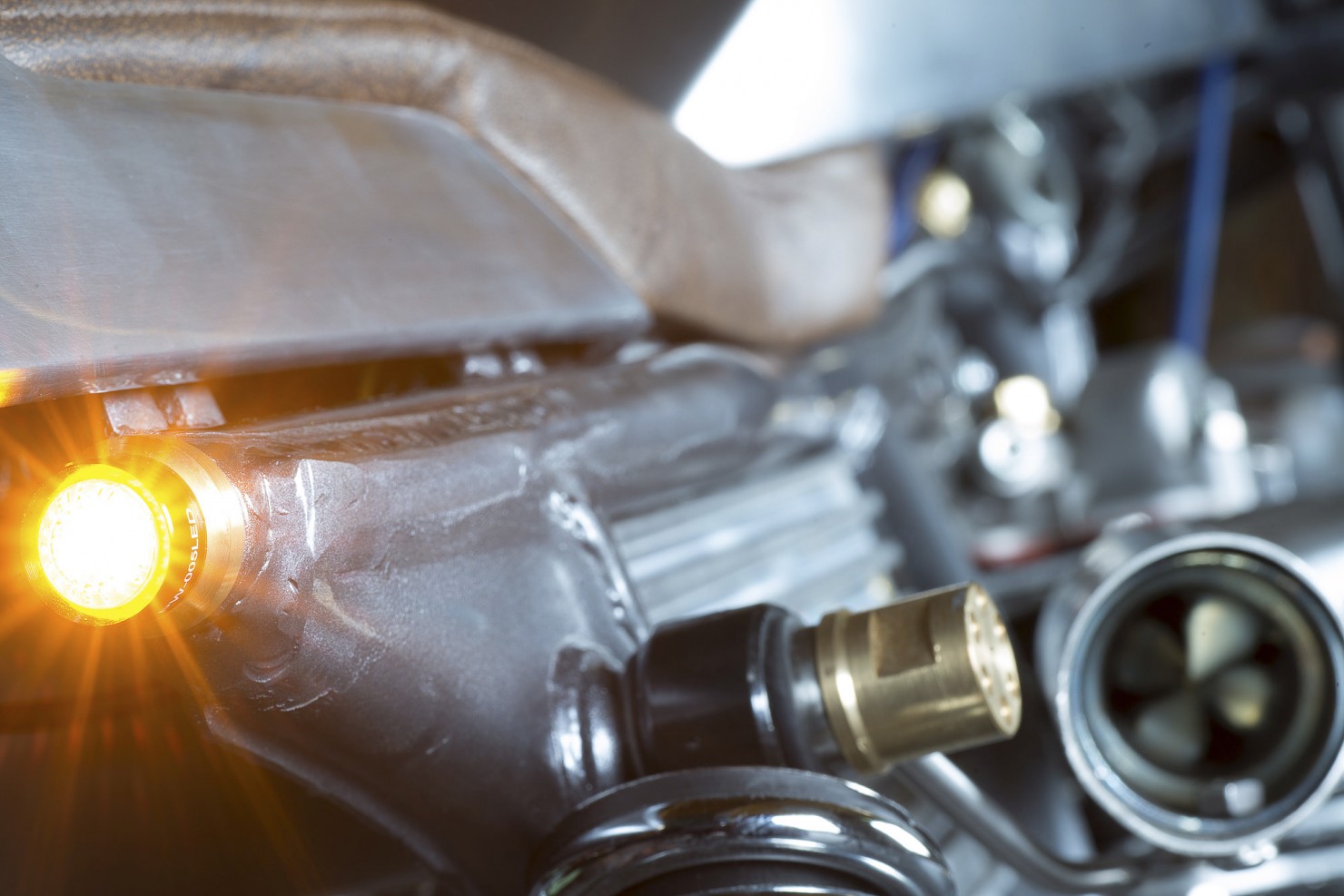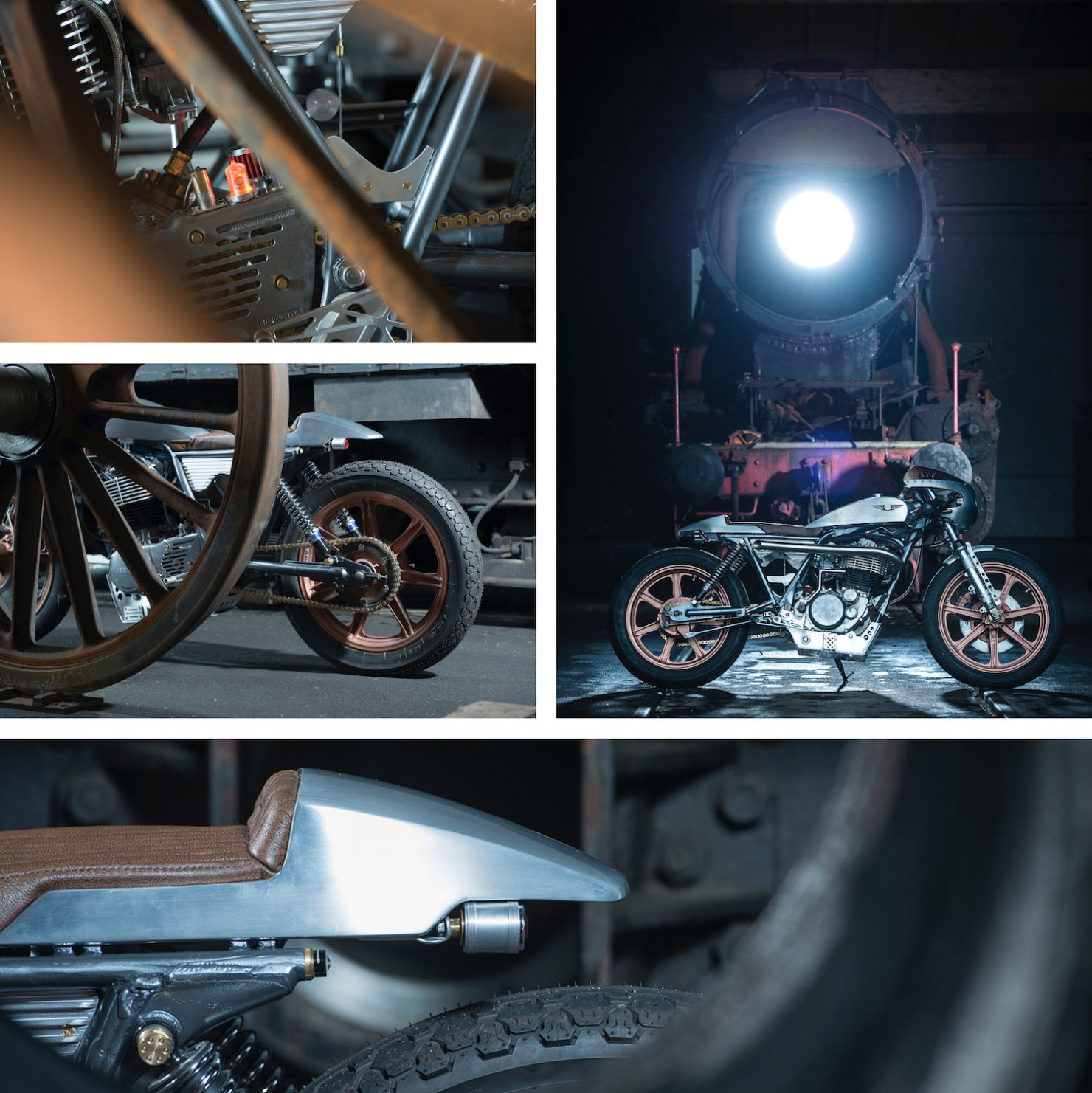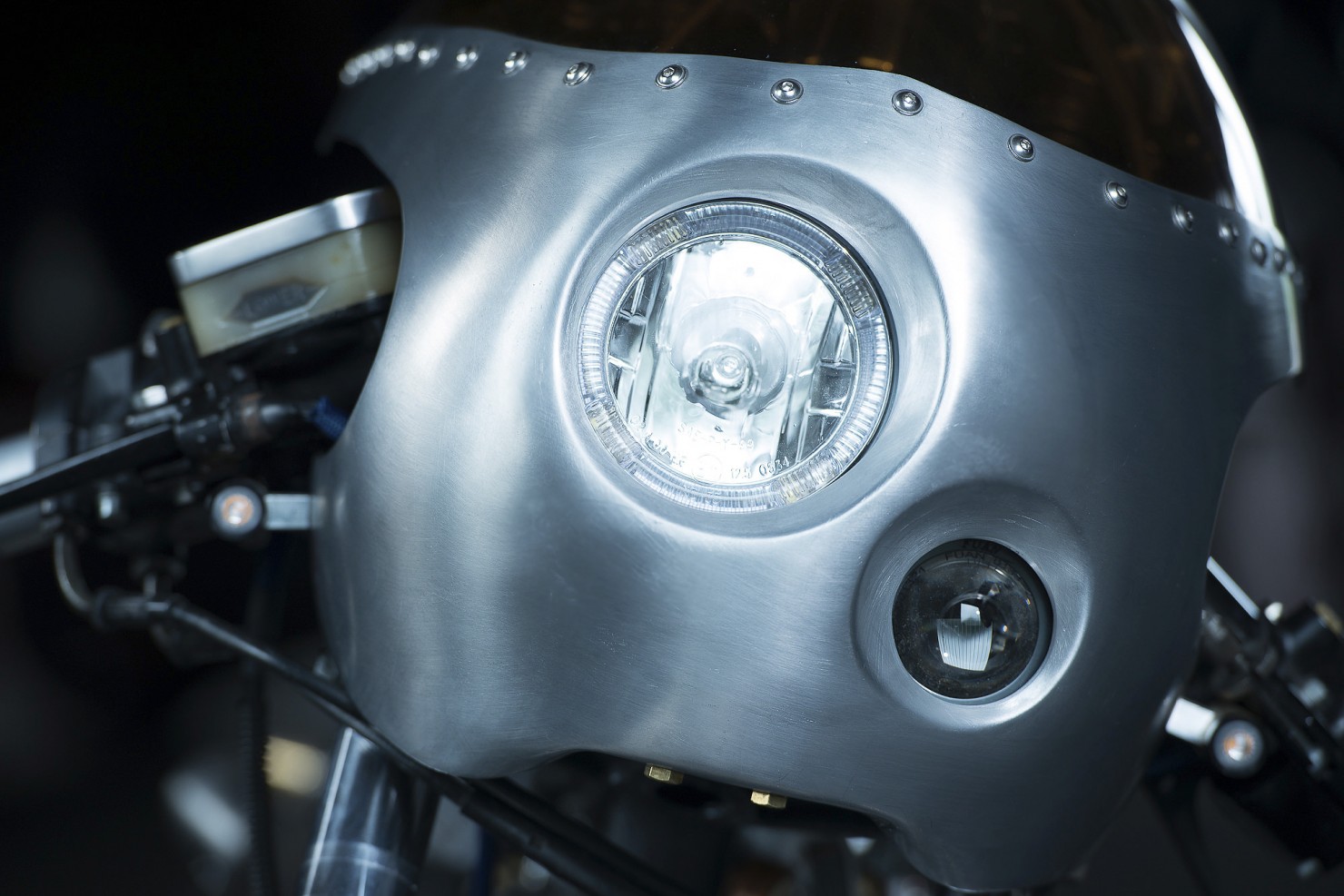 In order to keep weight down an aluminium fuel tank was ordered and matched with a custom built aluminium half-fairing, a custom seat was then built to spec by well-known custom bike builder Bernhard Naumann (also known as BLECHMANN). In-keeping with the steam punk theme the original stainless steel bolts were replaced with brass and the seat was upholstered with aged brown leather.