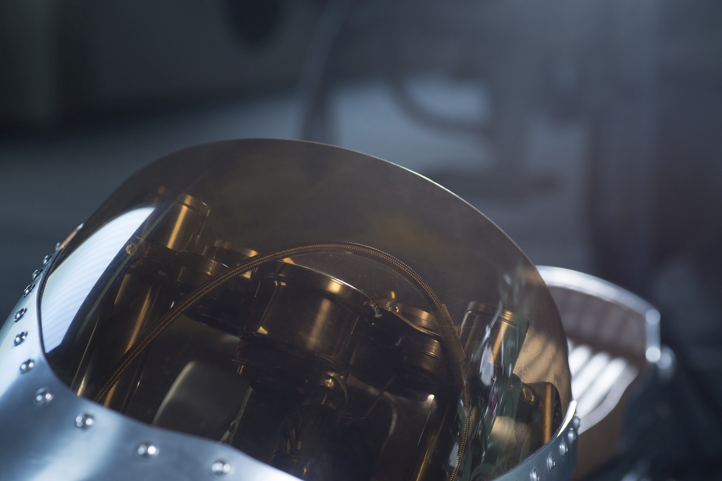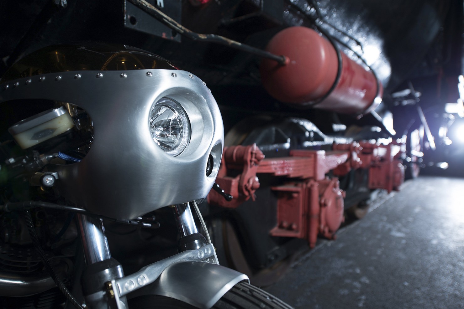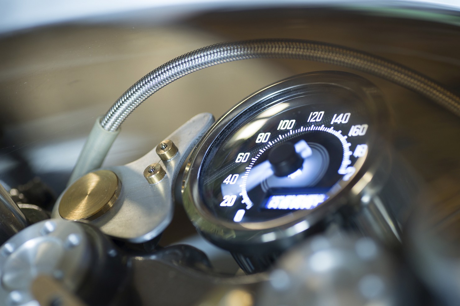 In order to keep weight down an aluminium fuel tank was ordered and matched with a custom built aluminium half-fairing, a custom seat was then built to spec by well-known custom bike builder Bernhard Naumann (also known as BLECHMANN). In-keeping with the steam punk theme the original stainless steel bolts were replaced with brass and the seat was upholstered with aged brown leather.