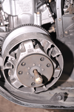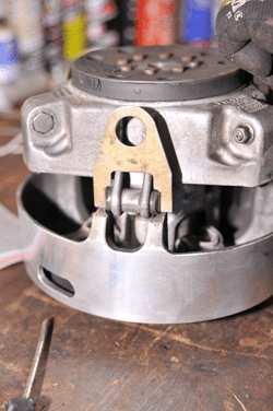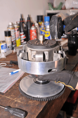 Once the bolt is removed, install the proper puller and tighten it up against the crankshaft end. The clutch assembly will pop off. If it is stubborn, a tap from a hammer on the end of the puller will make it pop off. The hammer tap offers a vibration that often works wonders for stubborn removals.