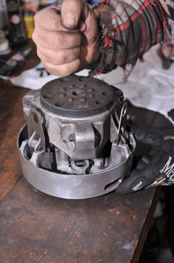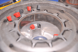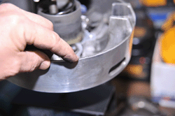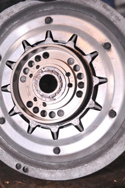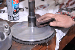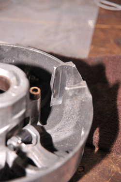 The clutch faces also are polished with a Scotchbrite pad. By using straight line strokes, one can deglaze these surfaces quickly. Remember to do both sides of the clutch so the belt can be grabbed with clean surfaces.