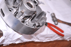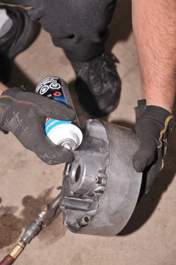 Using aerosol brake cleaner is a great cleaning agent for this job. It will break loose the toughest grime and belt dust residue. Another cleaning agent often used by race mechanics is acetone. This is a standard service, but we took another couple of steps, by taking the drive spring out for inspection and cleaning.