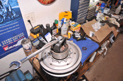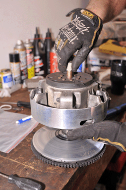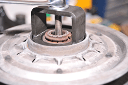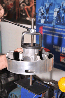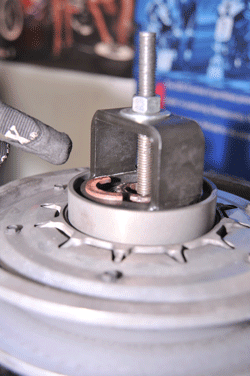 Once the clutch is off (it’s easier to work on it at the bench), the next step is to separate the two halves, using the puller that was used to remove the assembly. Use the same puller as seen here.