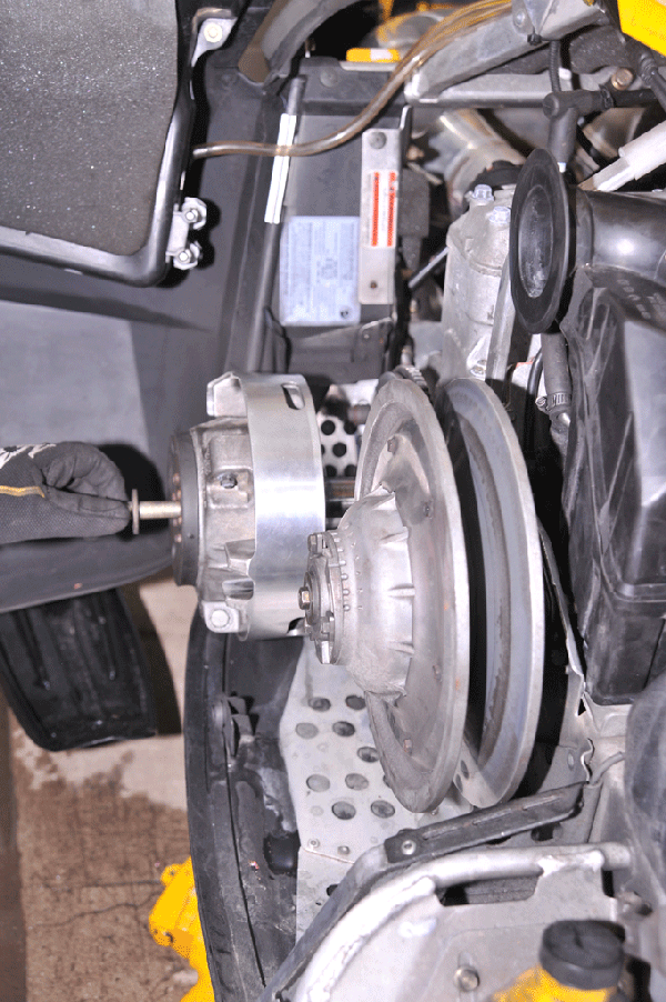 Removing this unit from the sled, you will need the proper puller. First remove the clutch bolt; this can be removed with an impact gun or a socket if you have a tool to prevent the clutch from turning.