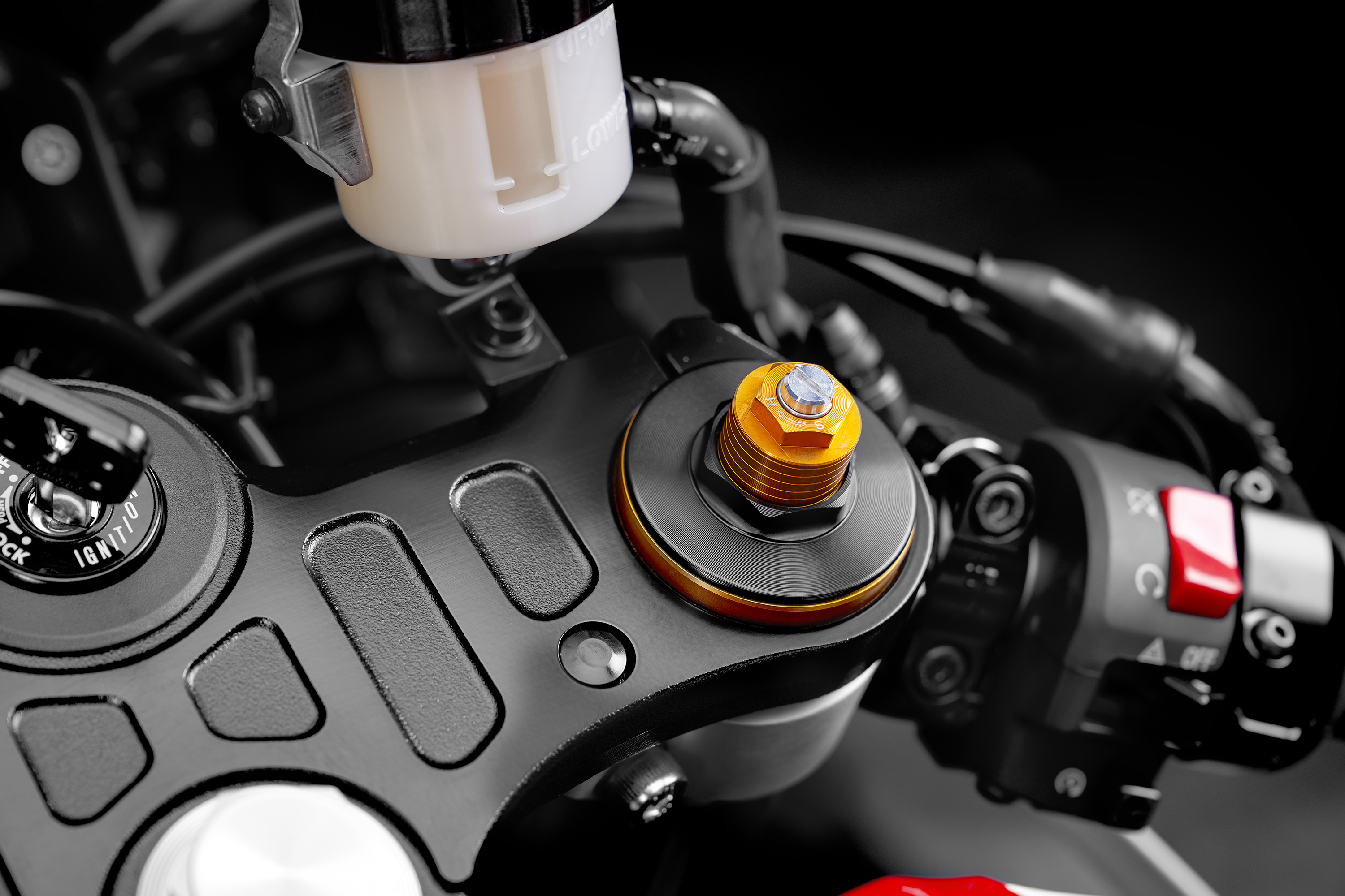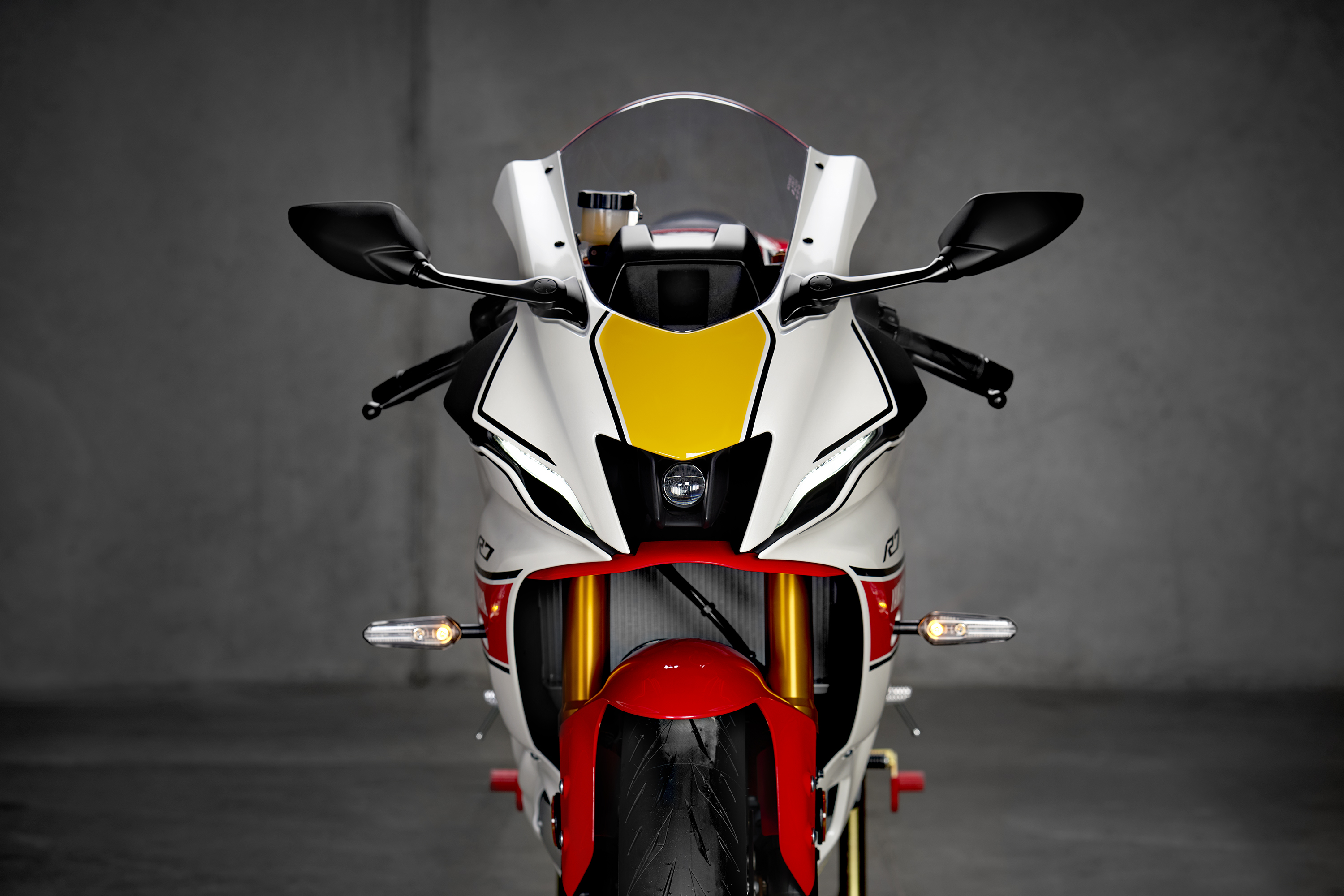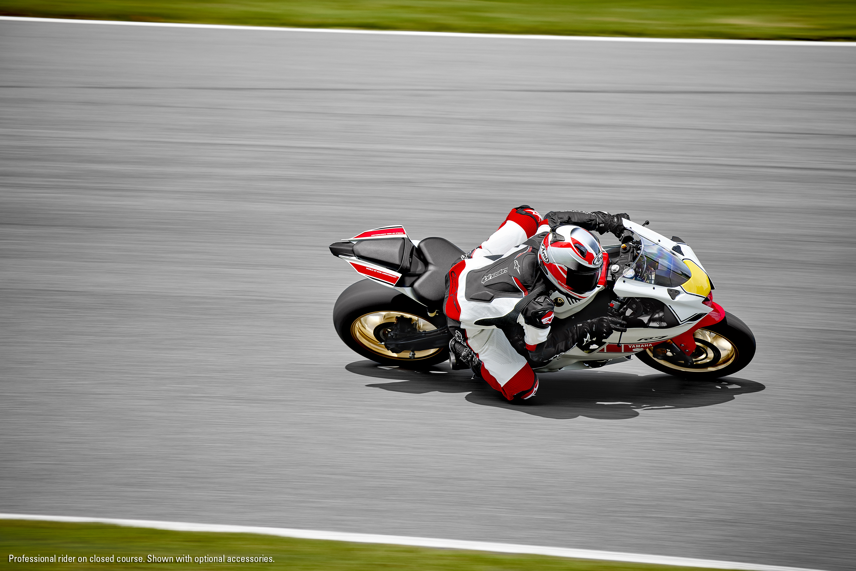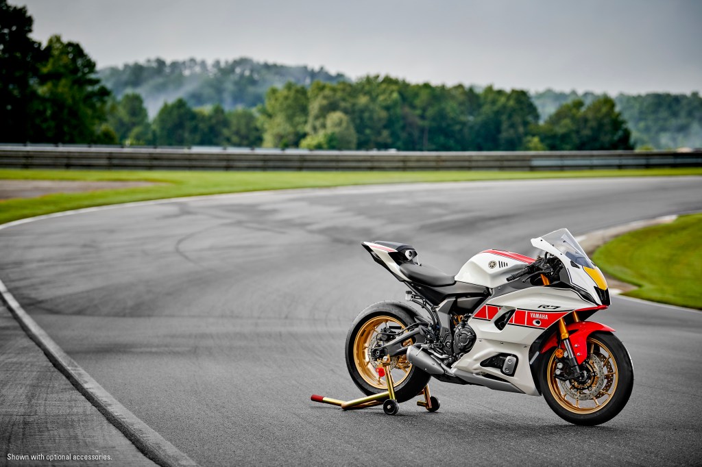 Along with the World GP 60th Anniversary color scheme, each bike also includes gold wheels, gold forks, Yamaha factory race-bike Gold Tuning Fork emblems, black levers and special commemorative badging on the airbox cover.