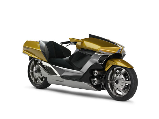 Stylized in a bright gold and looking like it’s speeding past while standing still, the bike features footwells suggesting a more recumbent or “foot forward” design typical of long-haul bikes, and it seems that was intentional, as the bike was designed with regenerative charging functions to encourage further travel on the gas/electric engine.